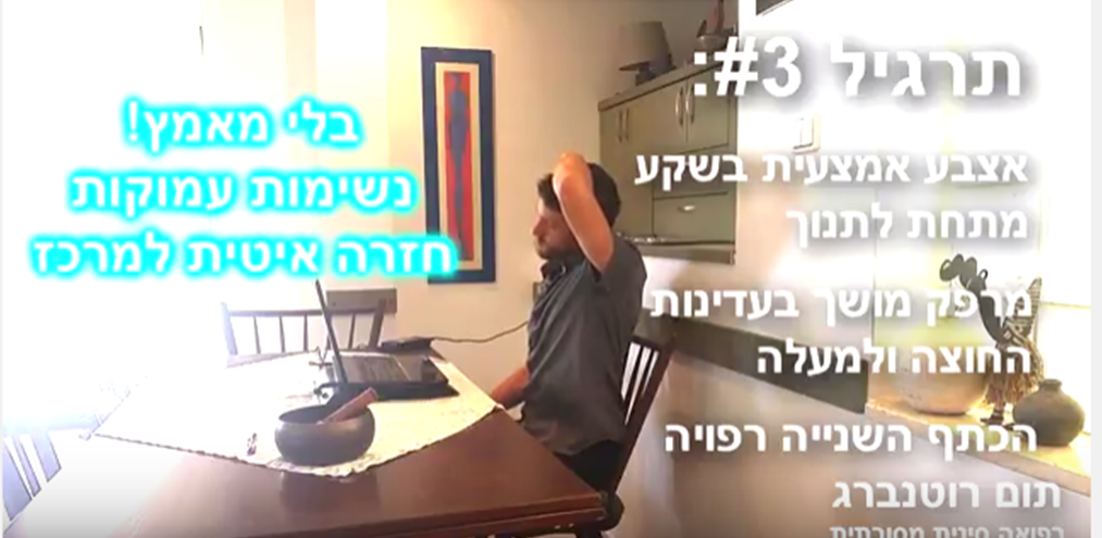 בנוסף, תוכלו להיכנס לקישור הזה ולצפות במדריך מצולם הכולל 7 תרגילים פשוטים, כאלו שניתן לבצע מול מחשב אפילו ומהווים – אימון של 3 דק' ביום להפחתה ומניעה של כאבי צוואר, עורף ושכמות.